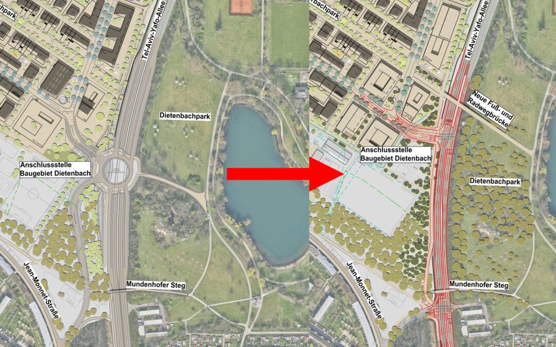 Mit der Umplanung müsste auch der Rahmenplan für den südlichen Stadtteileingang angepasst werden. Laut Stadtverwaltung soll das ohne Verzögerung des Gesamtzeitplans für Dietenbach möglich sein.
