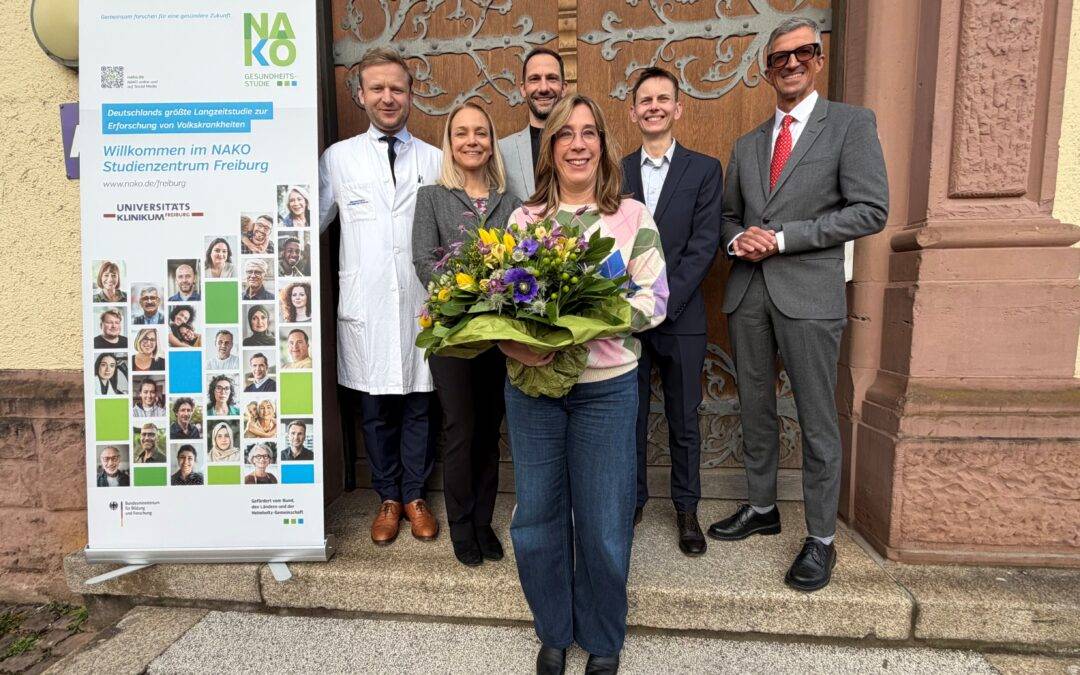 Die bundesweite Langzeitstudie untersucht seit 2014, wie Lebensstil, Umweltfaktoren und genetische Voraussetzungen das Risiko für weit verbreitete Erkrankungen beeinflussen. In Freiburg wurden im Rahmen der NAKO bislang mehr als 20.000 medizinische Untersuchungen durchgeführt sowie rund 98.000 Fragebögen ausgewertet. Die nun geehrte Teilnehmerin hatte bereits an den Untersuchungen in den Jahren 2016 und 2021 teilgenommen.