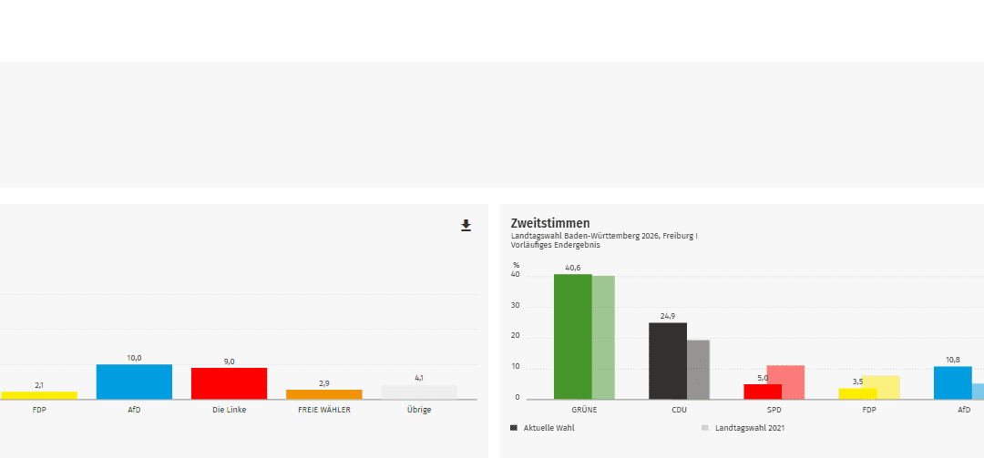 Auch bei den Zweitstimmen liegen die Grünen deutlich vorne. Sie erreichen 40,6 Prozent. Die CDU kommt auf 24,9 Prozent, gefolgt von der AfD mit 10,8 Prozent. Dahinter liegen Die Linke mit 8,4 Prozent, SPD mit 5,0 Prozent und FDP mit 3,5 Prozent.