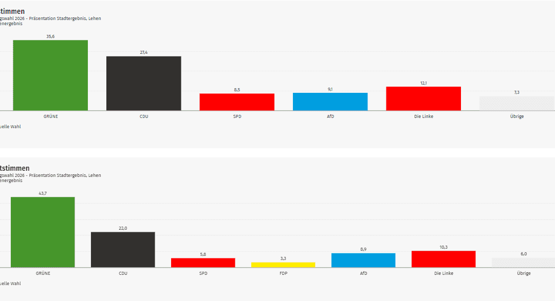 Bei den Zweitstimmen bauen die Grünen ihren Vorsprung deutlich aus. Sie erreichen 43,7 Prozent. Dahinter folgt die CDU mit 22,0 Prozent. Die Linke kommt auf 10,3 Prozent, die AfD auf 8,9 Prozent und die SPD auf 5,8 Prozent. Die FDP erreicht 3,3 Prozent.