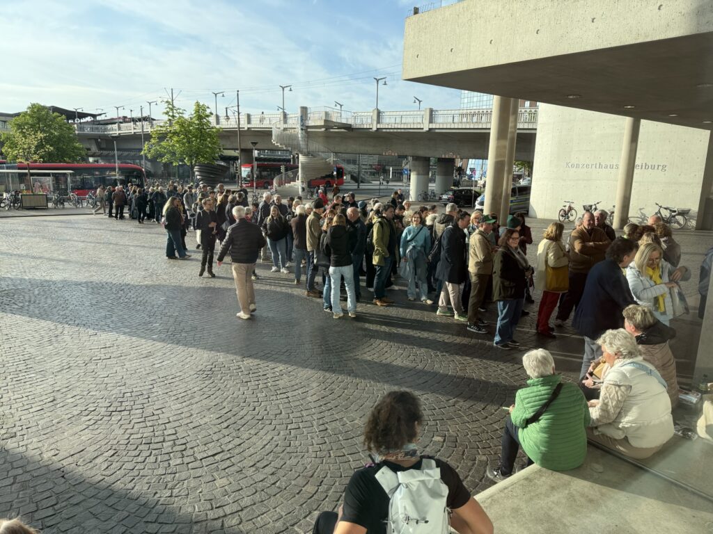 18:20 Uhr: Die ersten Menschen warten schon vor dem Konzerthaus Freiburg. Wahlkampfhelfer sind vor Ort und kommen schon mit einigen Gästen ins Gespräch.