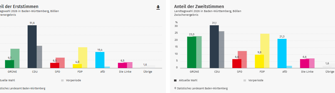 Auch die kleine Gemeinde Böllen im Landkreis Lörrach hat ihr Ergebnis der Landtagswahl 2026 schnell gemeldet. Die CDU liegt dort deutlich vorne.