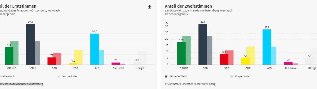 Auch die Gemeinde Wembach im Landkreis Lörrach hat ihr vorläufiges Ergebnis der Landtagswahl 2026 gemeldet. Die CDU liegt dort bei den Erststimmen deutlich vorne.