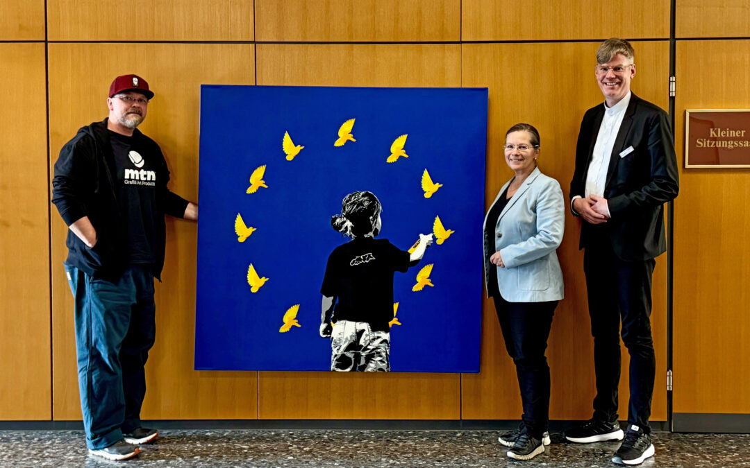 Ein Kunstwerk mit klarer Botschaft für Europa sorgt im Rathaus von Weil am Rhein für Aufmerksamkeit: Ein Junge, der gelbe Tauben sprüht, steht im Mittelpunkt der neuen Streetart-Arbeit.