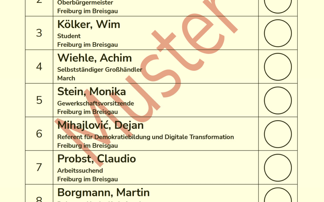 Am Dienstag, 31. März 2026, hat der Wahlausschuss der Stadt Freiburg die Kandidaturen für die Oberbürgermeisterwahl am Sonntag, 26. April 2026, zugelassen. Auf dem nun veröffentlichten Muster-Stimmzettel stehen neun Bewerber.